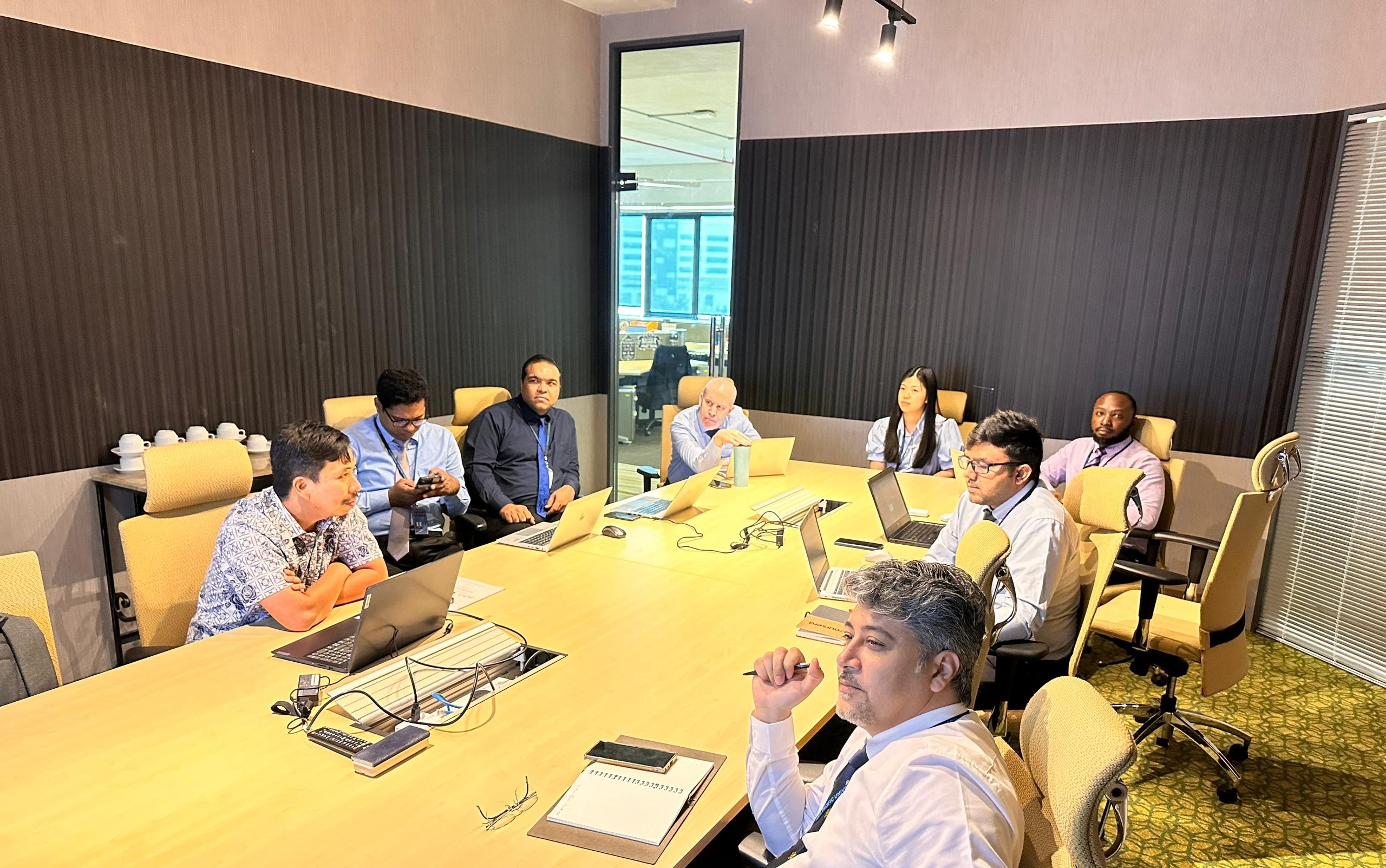 Dr Mohd Farhanulhakim (first from left) briefs APU academics and research scholars, led by Prof Dr Mohammad Falahat (first from right), on the essential requirements for Malaysian journals seeking inclusion in MyCite.